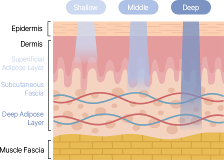 피부층, 지방층, 근막층(SMAS)까지 열 에너지를 고르게 전달